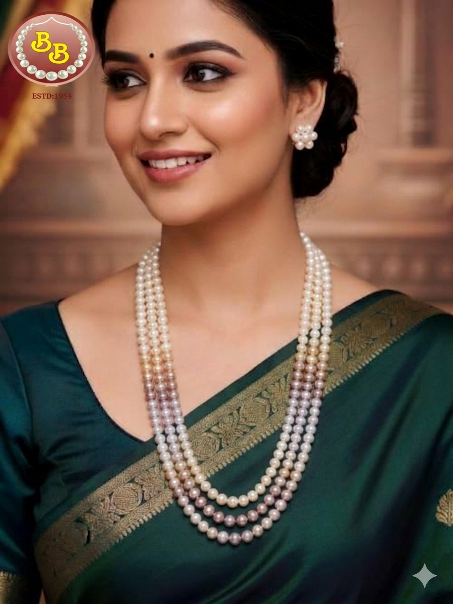 3 Lines Natural Color Combination Long Pearls Mala With Tops